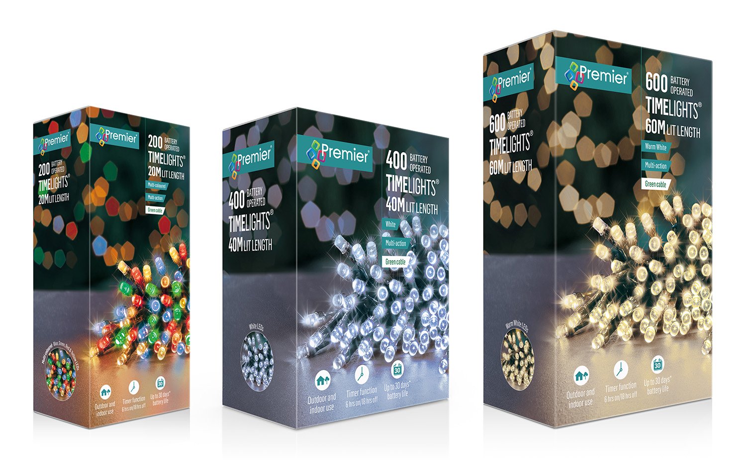 • Battery LED TimeLights® give a similar lit look to the TreeBrights, but don’t need a power source to plug into. Again, these include a timer and avoid trailing cables.