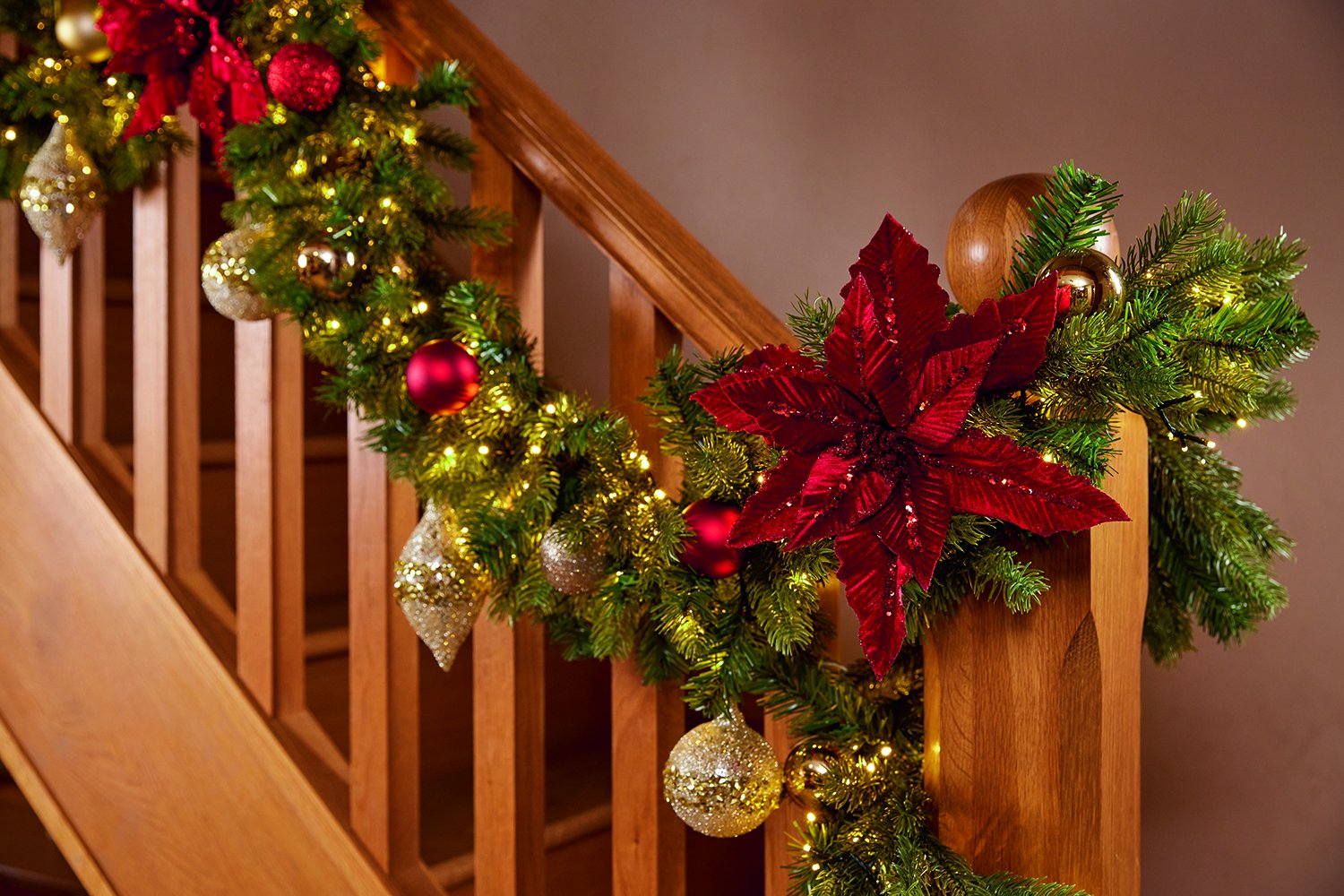 Spiral the garland around the rail for a tailored look. Fix at regular intervals and keep the wrap low on the outer edge so the top handhold remains usable. Finish with a tidy twirl around the end post to anchor the garland.