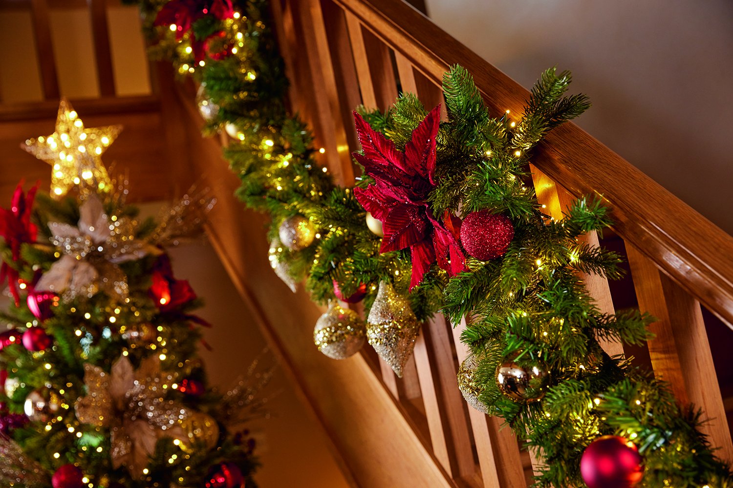 Limit yourself to 2-3 main colours plus one accent so the Christmas decor reads clearly from a distance. For a softer look, use fewer pieces and more greenery. A traditional twist is hanging Christmas stockings from the staircase; build them into the garland with fixings hidden in the foliage.