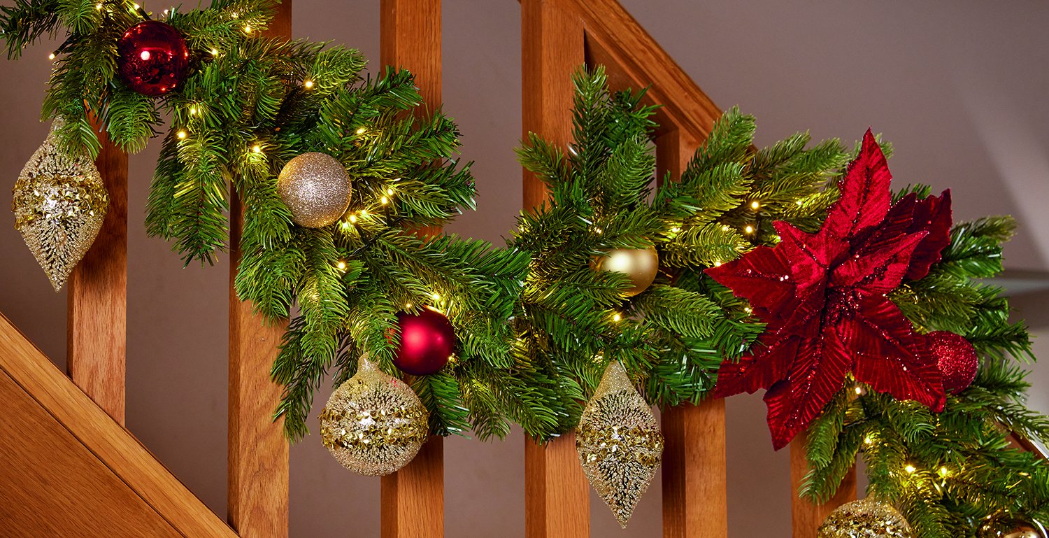 For a straight run, take the total handrail length and divide it by the length of your chosen garland to work out how many pieces you need, then round up. Set the garland just under the handrail for safe use and secure it to the spindles with zip ties.