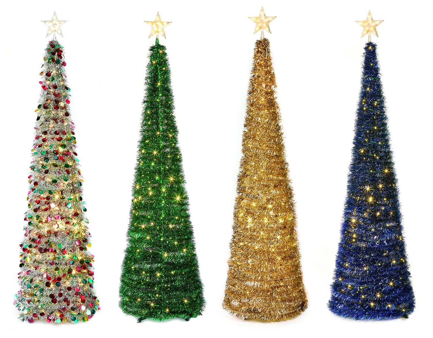 Pre-lit Tinsel Pop-Up Trees are a stylish, modern choice. They assemble in seconds, include low-voltage LEDs, and fold flat for effortless storage. Pick Silver for cool minimalism, Forest Green for classic comfort, Midnight Blue for evening drama, or Gold for elegant glamour. They suit renters, guest rooms, and home offices as beautifully as main living spaces. They also make an excellent second tree in larger homes.