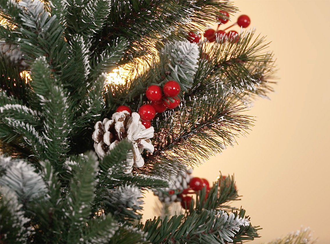 A snow-kissed woodland theme suits the Snowy Dorchester Pine beautifully. Its flocked branches look magical with warm white TreeBrights®. This tree lends itself to minimal décor, sophisticated baubles, and complementary floristry to enjoy the beauty of such a deluxe tree.